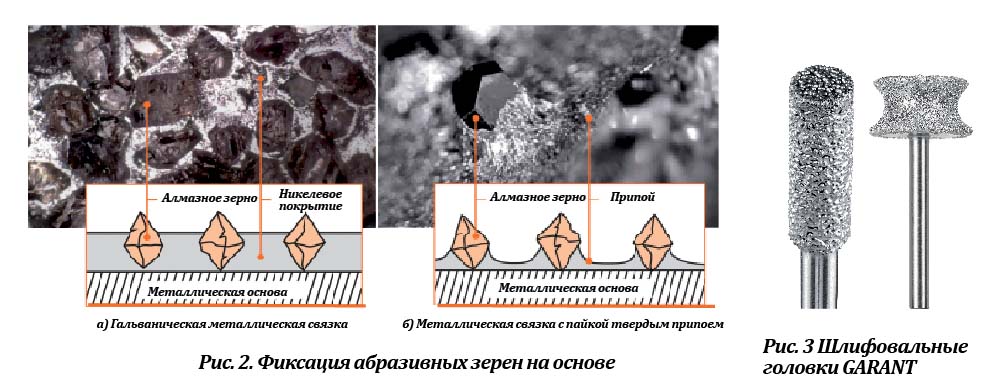 Инновационный подход к нанесению абразивного материала на основу – методом вакуумной пайки твёрдым припоем (рис. 2б) отличает алмазные шлифовальные головки GARANT (артикул №552750) от стандартных с гальванической металлической связкой (рис. 2а). Благодаря крайне тонкому слою припоя объем выступающего зерна составляет до 70%, что снижает температуру шлифования и склонность к засаливанию, а применение абразива крупной фракции D427 значительно повышает производительность съема материала. Отдельное внимание следует обратить на тот факт, что данные шлифовальные головки предназначены как для установки на промышленные роботы и шлифовальные станки с ЧПУ, так и для использования с ручным механизированным инструментом, что позволяет осуществлять любые операции по обработке кромок и контуров.