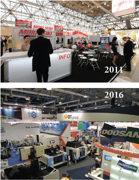 Объемы производства металлообрабатывающих станков в 2010 году относительно 2000 года рухнули на 30%, и доля российских производителей на внутреннем рынке опустилась ниже десяти процентов. Установка начала 1990-х «продадим нефть и купим то, что нам надо, на зарубежных рынках» коренным образом повлияла на исторический ход событий... Выставка «МЕТАЛЛООБРАБОТКА» ежегодно показывала стабильный рост экспонентов и посетителей. Иностранные производители стали привозить много больших высокотехнологичных станков и выставлять их как самостоятельно, так и в составе отраслевых национальных стендов. Немцы все так же доминируют, и неоспоримым лидером среди них является концерн DMG MORI, размещающий свою экспозицию на двух стендах, занимающих практически целый зал в павильоне два.