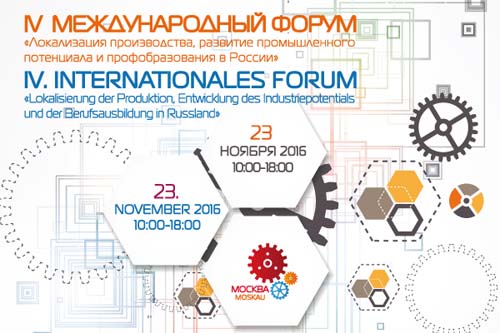 23 ноября 2016 годаРоссийско-Германская внешнеторговая палата организует 4-й международный форум «Локализация производства, развитие промышленного потенциала и профобразования в России», который пройдет в отеле «Балчуг Кемпински» в Москве.