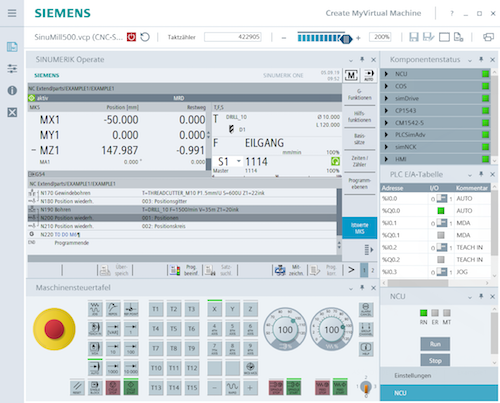 Проектирование станка с этой системой управления начинается в программной среде CreateMyVirtual Machine, которая, по сути, является квинтэссенцией хорошо знакомых продуктов для любого пользователя продуктов «Сименс», таких как TIA Portal, SinuTrain, Starter и MCD от Siemens Digital Industries Software (SISW). Разработчик станка получает возможность начать проектирование, не ожидая компонентов станка, и тем самым сократить время выхода продукта на рынок. Среда дает возможность оптимизировать алгоритмы работы ПЛК, проверить работу на возможные коллизии. Но, главное, этот программный продукт позволяет ускорять реальное время работы ядра при подключении его к облаку или дата-центру. Что это дает?