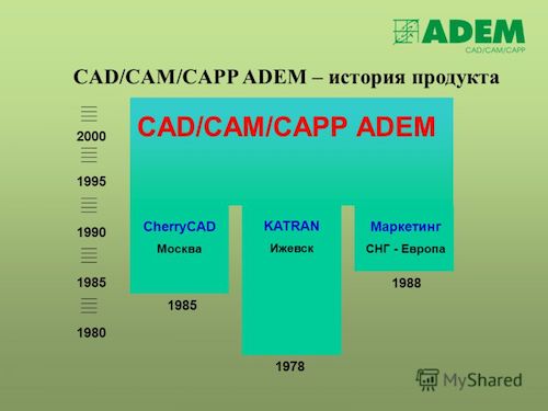 Развитие «плоских чертилок», как иногда называют 2D-системы, пришлось на период 1985–1990 гг. В 1987 г. компанией ADEM была выпущена первая версия системы Cherry CAD («черри» — аббревиатура слов чертить, рисовать), главным передовым на то время отличием которой был иконный интерфейс, устранявший необходимость длительной подготовки пользователей.