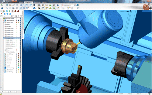 SprutCAM содержит в себе мощный модуль симуляции обработки, который позволяет моделировать процесс обработки детали на любом станке, предварительно созданном на основе его кинематической схемы и 3D модели. Возможность моделирования обработки с использованием системы контроля точности, позволяет оптимизировать технологию обработки по критериям трудоемкости, ресурса инструмента, сохранности оборудования и пр. В процессе симуляции производится автоматический контроль процесса обработки детали с учетом перемещений всех исполнительных и вспомогательных органов станка на предмет предотвращения коллизий.