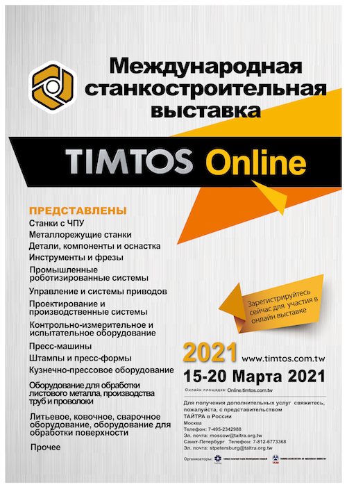 Как и планировалось, TIMTOS 2021 Online (online.timtos.com.tw) будет проходить с 15 по 20 марта, а посмотреть мероприятие в записи можно будет с 21 марта по 15 апреля. Официальный сайт TIMTOS продолжит работу онлайн-сервисов в течение года. Следите за обновлением деловой программы и расписанием выставки TIMTOS 2021 Online на официальном сайте мероприятия.